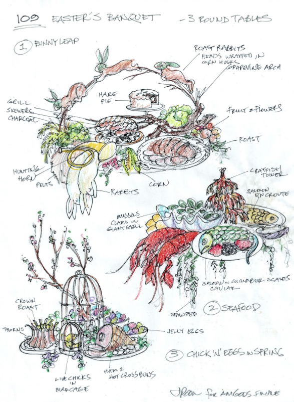 Lo sketch per il banchetto di Pasqua alla fine della prima stagione di ‘American Gods’. Courtesy of Janice Poon