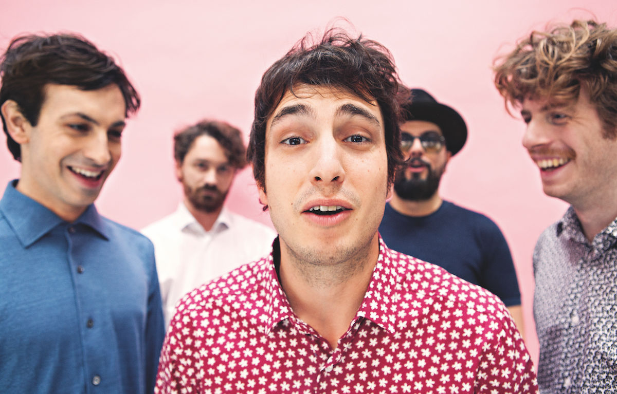 Lo Stato Sociale. Da sinistra in senso orario: Lodo, Carota, Bebo, Checco, Albi. Foto Federica Lazza – Style Francesca Piovano – Abiti CC Collection Corneliani
