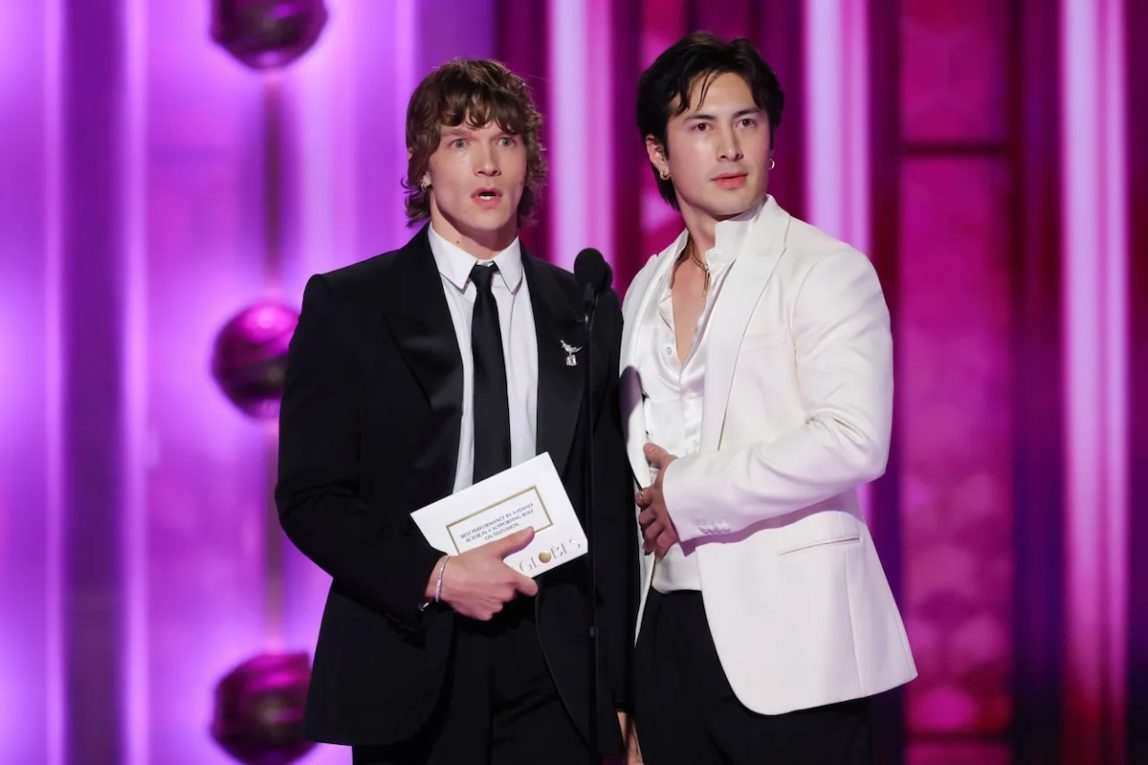 Dopo una pausa confusa nello show — diversi secondi senza musica, senza voce fuori campo e senza nessuno sul palco — un annunciatore ha proclamato l’arrivo della “sicurezza” per le star di Heated Rivalry, Hudson Williams e Connor Storrie. All’improvviso, tra luci stroboscopiche e riff di chitarra piuttosto cafoni, due combattenti di Ultimate Fighting Championship (supponiamo?) hanno fatto il loro ingresso tronfi sul palco… per poi sgattaiolare via quasi subito, come se si fossero già pentiti dell’idea. Sconcertante! Per fortuna, Williams e Storrie si sono ripresi la scena prima che avessimo il tempo di pensarci troppo su.