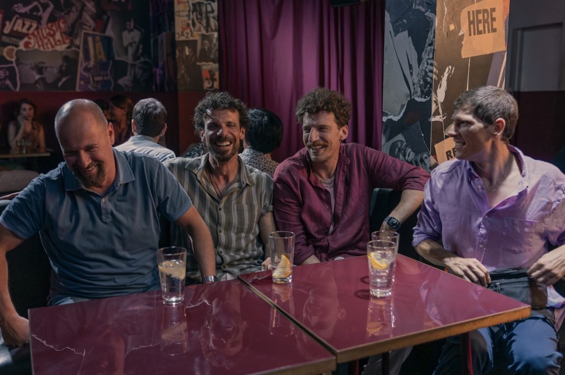 Pietro Sermonti (Luigi), Francesco Montanari (Riccardo), Maurizio Lastrico (Mattia), e Matteo Martari (Massimo) in ‘Maschi veri’. Foto: Netflix