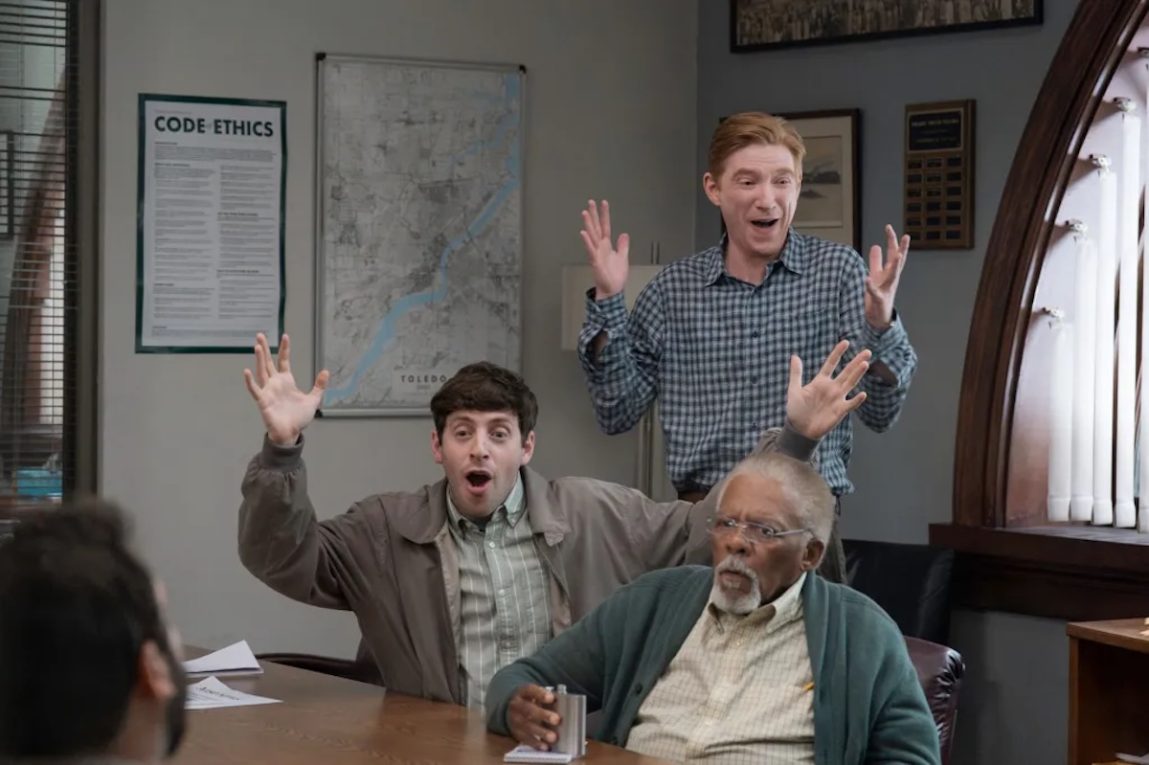 Alex Edelman, Domhnall Gleeson e Duane R. Shepard in ‘The Paper’. Foto: AARON EPSTEIN/PEACOCK