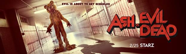 La tagline recita “Evil is about to get schooled”, con un nuovo essere e l’ombra di Ash (e della sua mitica motosega) sullo sfondo del corridoio pieno di armadietti di una scuola.