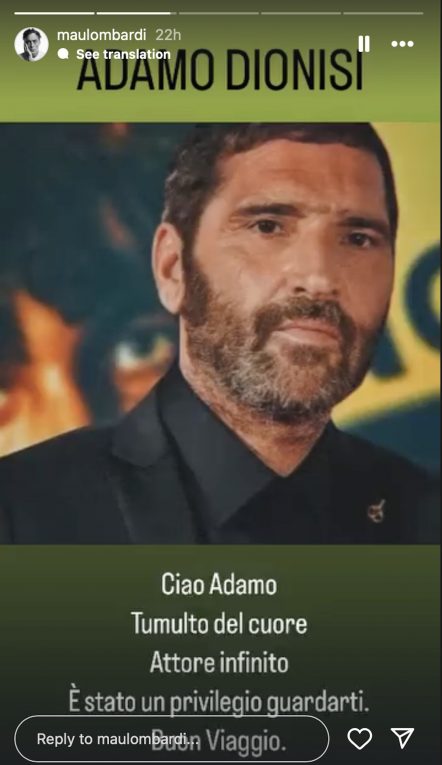 Tra chi ricorda l’attore sui social anche Maurizio Lombardi, che l’ha voluto in Marcello, il corto esordio alla regia in cui Dionisi regala alcune frasi instant cult: “Er cinema è un atto d’amore”, ma anche “Er cinema lo fa solo chi è cattivo”. «Ciao Adamo, tumulto nel cuore, attore infinito, è stato un privilegio guardarti. Buon viaggio», lo saluta Lombardi.
