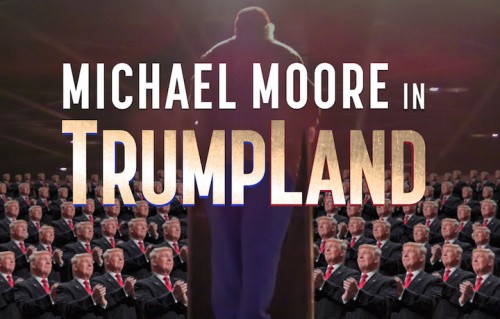 Il regista di documentari Michael Moore aveva annunciato su Facebook a fine settembre che avrebbe fatto una “october surprise” ai suoi fan: un one-man show dedicato alle elezioni presidenziali, con una sola data a Wilmington, Ohio – definito “Il cuore del Trump Country”. Lo spettacolo è stato anche filmato, e il risultato è Michael Moore in Trumpland, il nono lungometraggio del regista, presentato a sorpresa il 18 ottobre a New York.