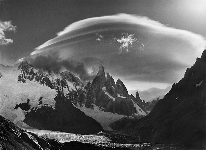 ‘Un ghiacciaio ai piedi del Cerro Torre, della Torre Egger e della Punta Herron, cime situate in Patagonia al confine tra Cile e Argentina, 2007’. © Sebastião Salgado