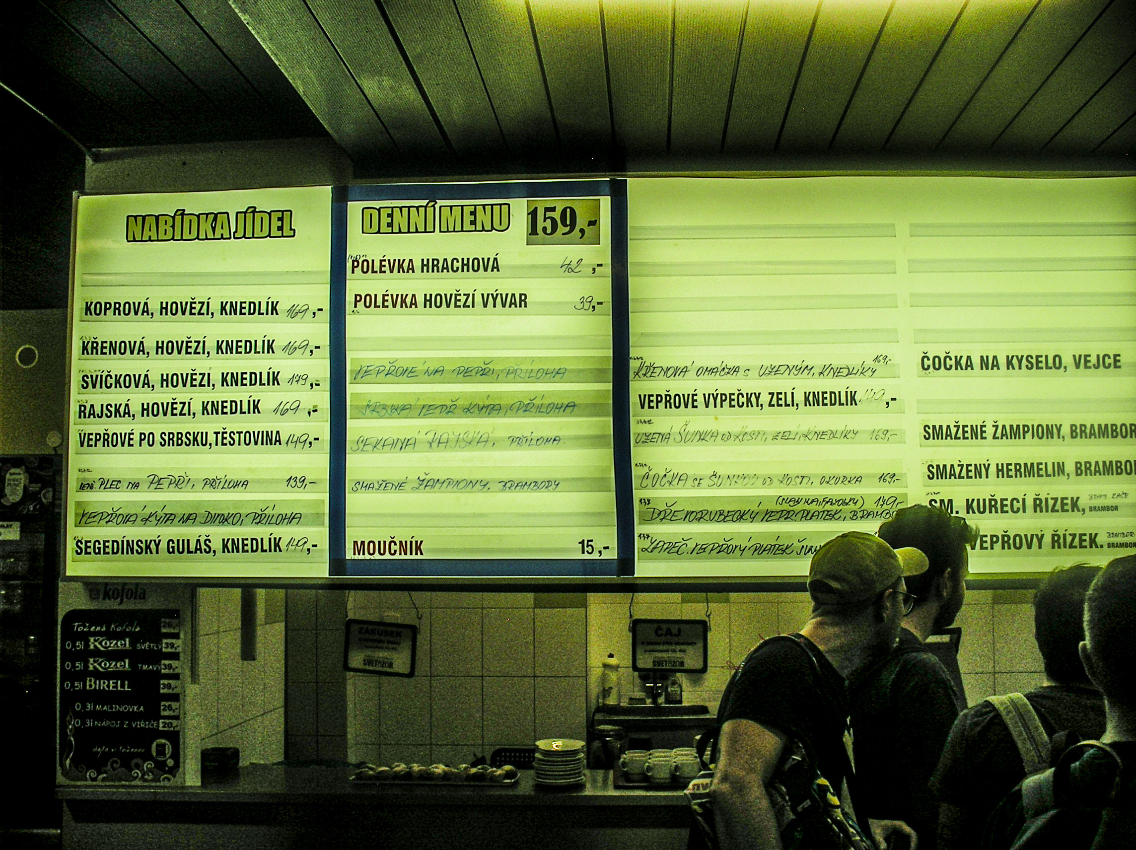 Se, viste le scale, sarebbe lecito aspettarsi una delle terrazze sulla Moldova, il fatto che si scenda invece per due piani al di sotto della strada è solo la prima delle rivendicazioni involontarie di questo Jídelna Světozor. Una volta raggiunto, la prima cosa che si nota è la gigantesca lavagna al neon su cui sono scritti i piatti del giorno e quelli fissi, tutti appartenenti alla grande tradizione carnivora della Repubblica Ceca. Questa storia che parla di stufati e spezzatini di manzo e maiale, serviti con pasta, riso o i knedlíky, i gnocchi di pane di dimensioni struttura ondivaghe.