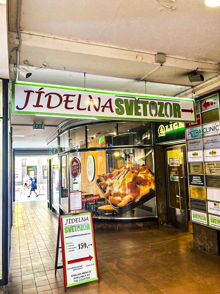 Il Passage Světozor è una delle tante gallerie commerciali nel centro di Praga. È conosciuto per via della vetrata a mosaico che ne domina uno degli ingressi e per il cinema Kino, dove venne ospitato il Kinoautomat di Radúz Činčera, una sorta di Bandersnatch ante litteram, in cui il pubblico decideva lo svolgimento del film tramite una votazione. Non siamo qui per questi motivi, ma per un espositore piazzato al centro della porta che dà sul vialone Vodičkova. C’è un menu dentro una busta da raccoglitore e una freccia disegnata che dice 10 metri a piedi indicando quello che, più di un ristorante, sembra un palazzo di uffici.