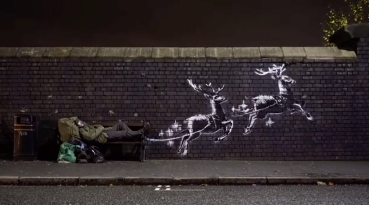 L’opera, che raffigura due renne attaccate alle redini, è dipinta a destra di una panchina. Un video condiviso da Banksy su Instagram mostra un clochard di nome Ryan mentre si sistema per la notte, posizionandosi al posto di Babbo Natale e della sua slitta.