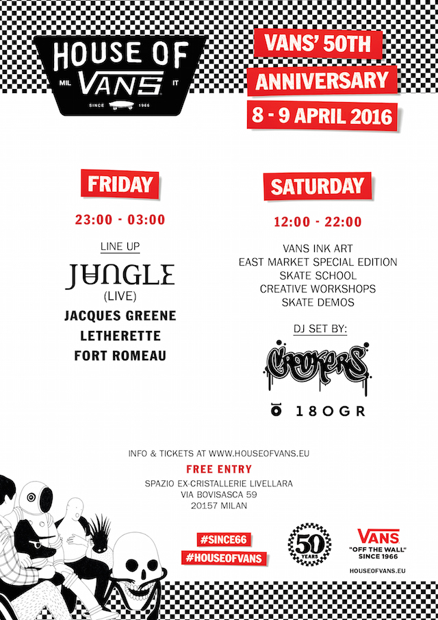 Negli spazi delle Ex-Cristallerie Livellara, venerdì sera si terrà il party di inaugurazione, con il live soul dei Jungle e i dj set di Letherette, Jacques Greene e Fort Romeau. Sabato, invece, una serie di workshop a cura di Lovenskate e Lilli Cowley Wood, i tagli di capelli gratuiti dei barbieri dell’AONO Barber Shop. Nell’area verrà anche allestita una versione Back to ’66 dell’East Market milanese, con pezzi da collezione, abbigliamento, sneaker e un sacco di altri contenuti che hanno segnato 50 anni di Vans.