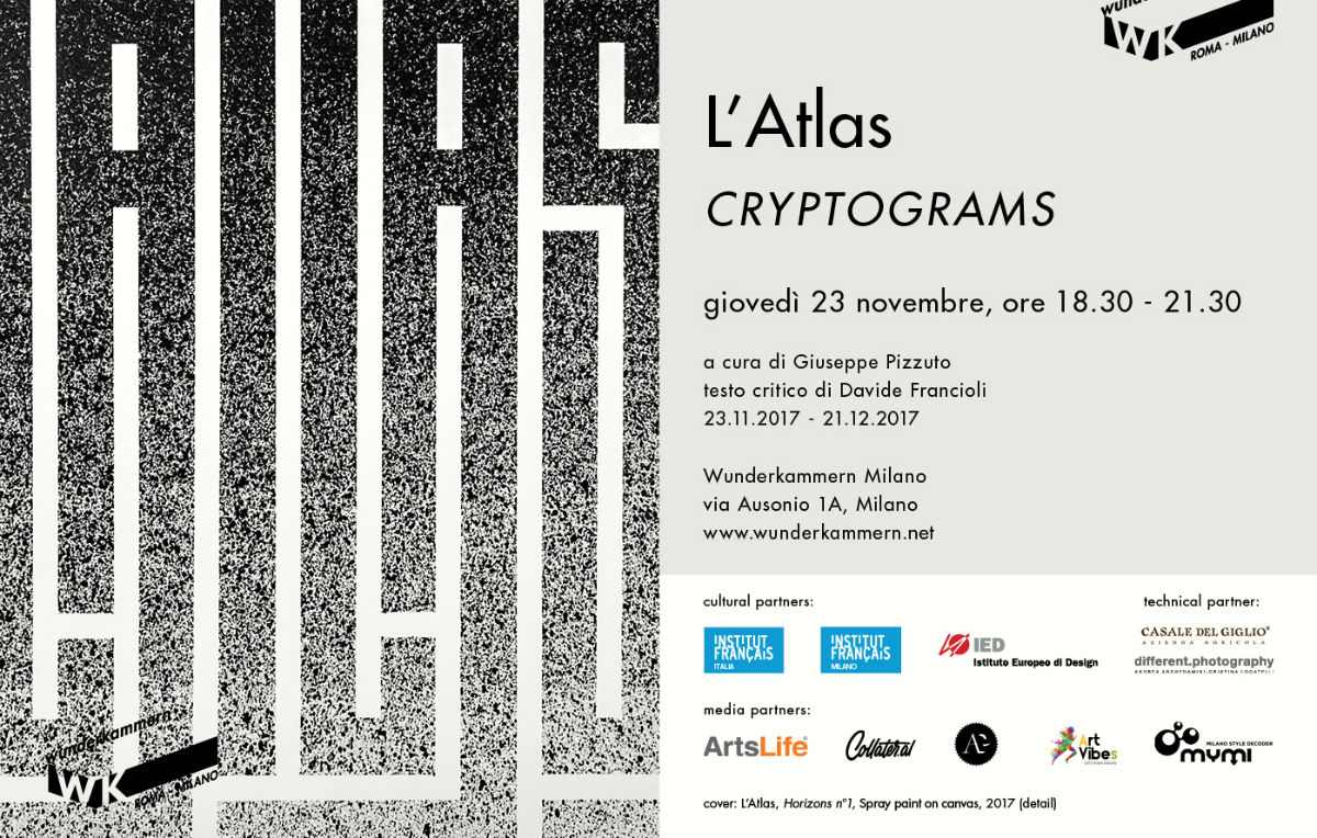 Dopo un primo periodo passato dipingendo nelle strade di Parigi, L’Atlas ha sviluppato un interesse per la calligrafia cinese, araba ed ebraica, che l’ha portato a viaggiare in diversi paesi del mondo. La sua arte è una sintesi di Graffiti, Astrazione Geometrica, Arte Optical e cinetica. La nuova personale è dedicata ai crittogrammi, testi in codice che necessitano un’interpretazione e traduzione. Quelli di L’Atlas sono labirinti astratti, con lettere nascoste nelle geometrie surreali che mescolano calligrafia, arte cinetica e inganni percettivi.