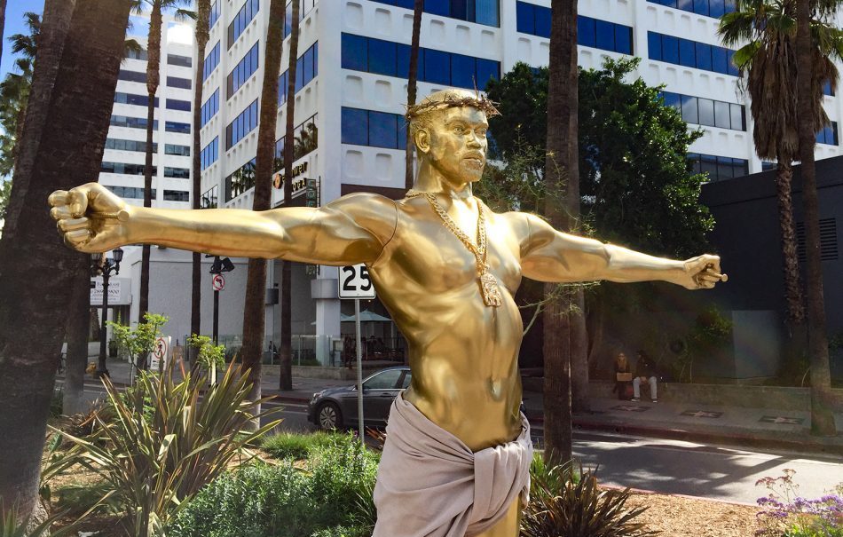 Anche quest’anno, come se fosse una sorta di tradizione annuale, durante la settimana degli Oscar, l’artista di Los Angeles Plastic Jesus ha svelato una nuova, enorme statua, questa volta a forma di Kanye West. L’opera, un gigantesco Gesù dorato, è stata esposta sull’Hollywood Boulevard. «Sono poche le celebrità ad essere state trasformate in figure divine» ha dichiarato Plastic Jesus a Rolling Stone a proposito del suo ultimo progetto. «Il ruolo che rappresentano nella società e nella cultura è molto più grande del loro lavoro. Penso che questo sia quello che è successo a Kanye».