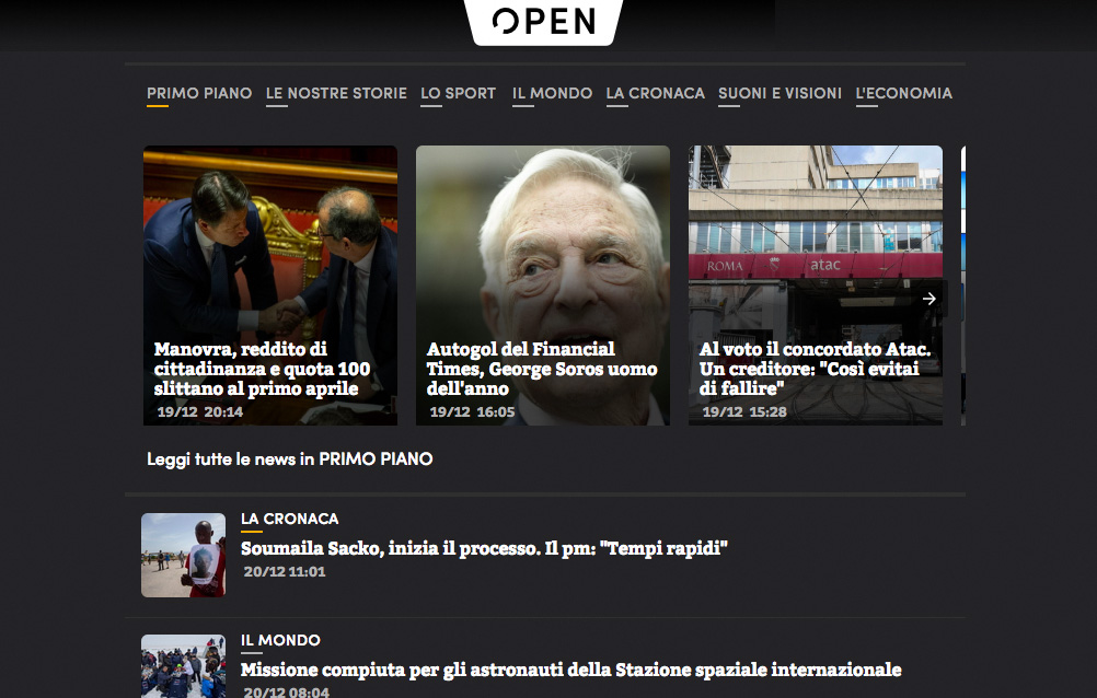 Per questo, quando Open è andato live, mi sono morso più volte la lingua per non commentare il saggio di Natale da scuola di giornalismo della Mentana e Associati, il design improbabile, il font egizio poco leggibile, la sciatteria dei titoli tipo vetrina dei tg “tema-virgola-soggetto”, le sezioni chiamate “la cronaca” e “le nostre storie” che ricordano gli scaffali di Eataly “la carne” o “il nostro caciocavallo”. Qualcuno mi ha fatto notare anche un titolo che chiamava “Kroll” l’allenatore del Liverpool “Klopp”, ma questi sono incidenti di percorso che capitano anche nelle macchine editoriali più oliate, figuriamoci in una start up costruita intorno a ragazzi alla prima esperienza professionale.