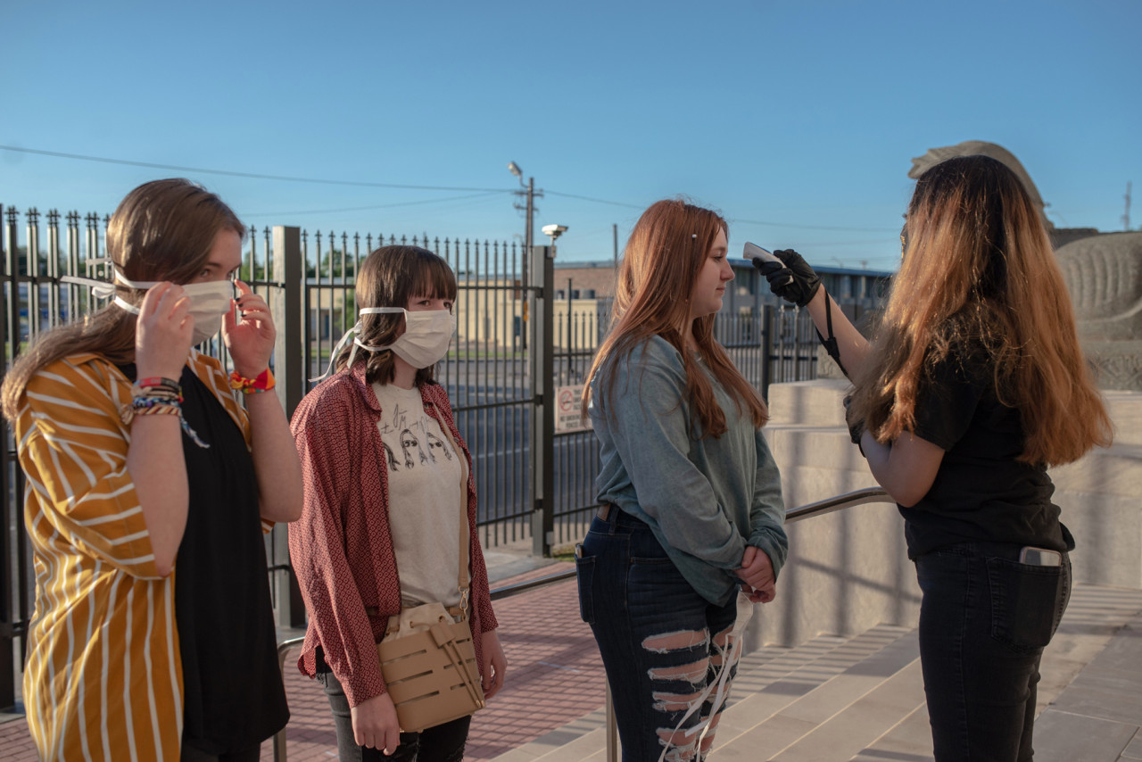 Lunedì 18 maggio, il cantante americano Travis McCready si è esibito al Temple Live in Fort Smith, Arkansas in quello che è stato definito il primo concerto nell’epoca del Covid-19 di fronte a un vero pubblico negli Stati Uniti. Sono state applicate le precauzioni segnalate dal Dipartimento della salute americano. Risultato: una performance in una sala mezza vuota, col pubblico seduto e ben distanziato, qualcosa di simile a quanto previsto in Italia dal decreto del Presidente del Consiglio dei ministri del 17 maggio che regola i concerti che si potrebbero tenere nell’estate 2020 nel nostro Paese. In questa foto, un’addetta misura la temperatura ai fan in fila per entrare.<br /><br />Foto di September Dawn Bottoms per Rolling Stone