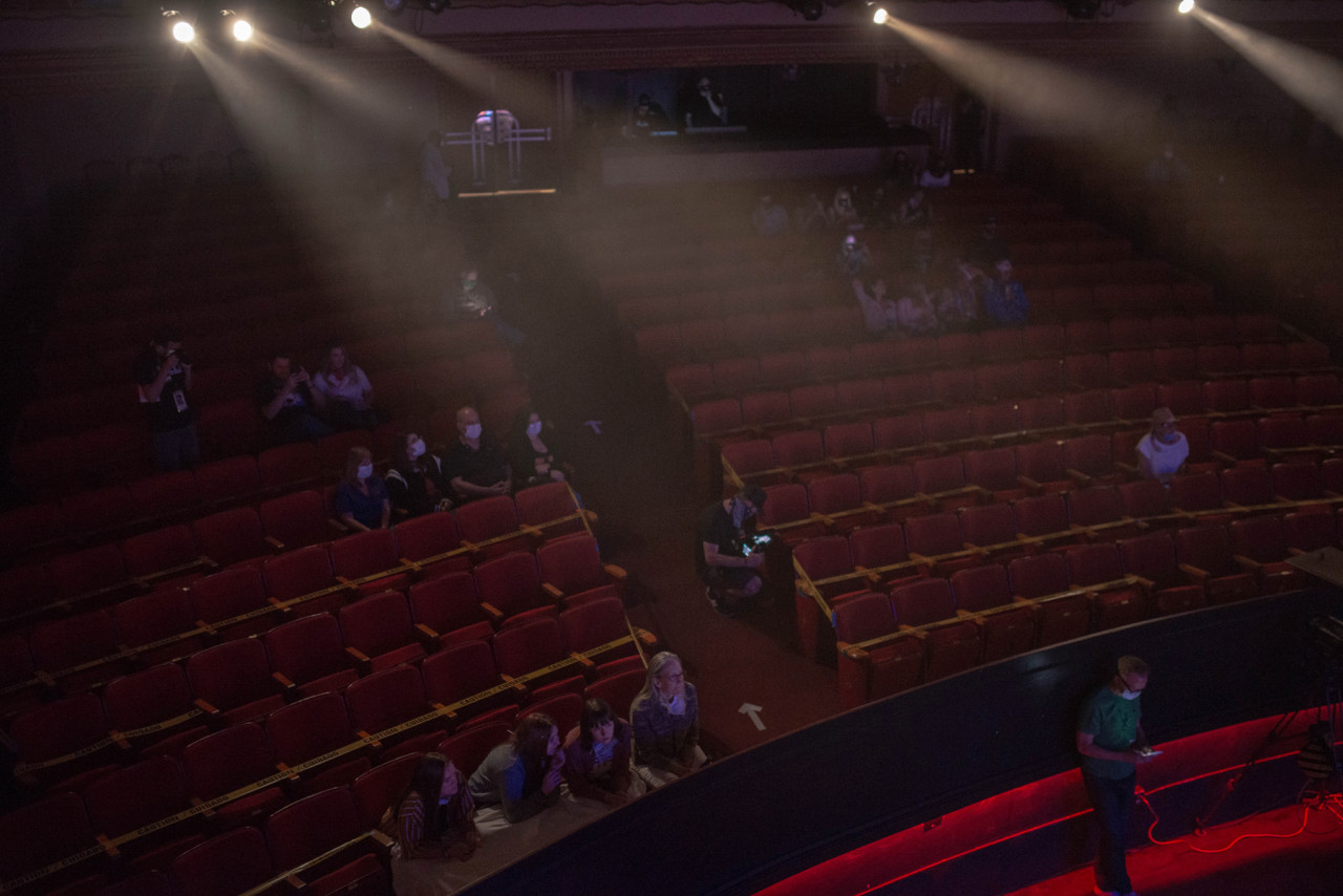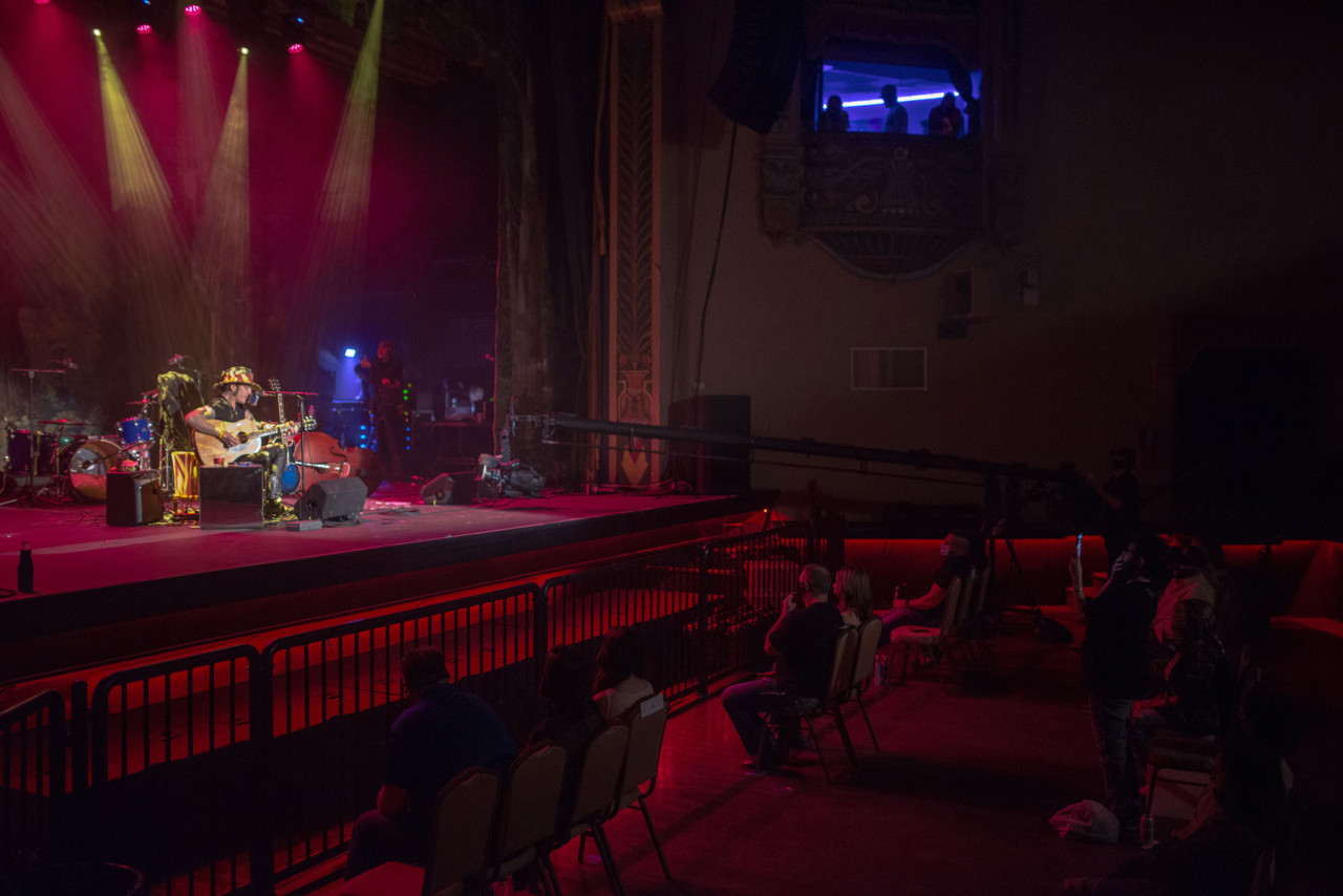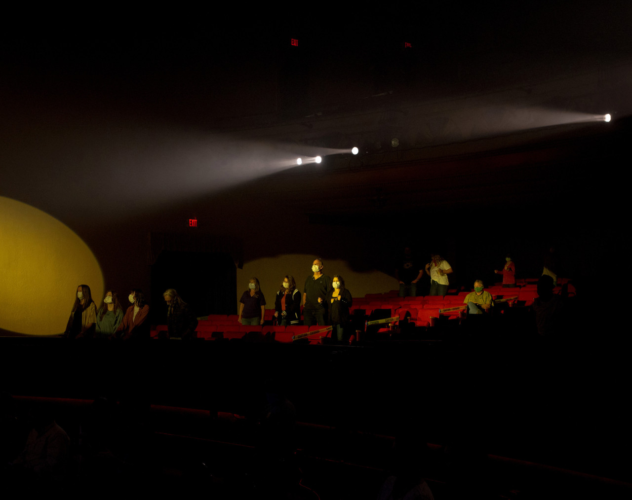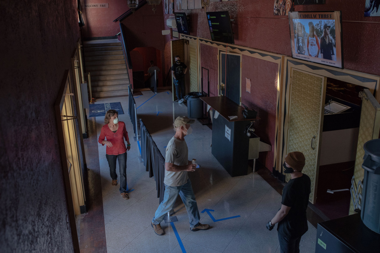 Lavoratori con guanti e mascherine si assicurano che all’interno del teatro sia tutto pronto per il concerto.<br /><br />Foto di September Dawn Bottoms per Rolling Stone