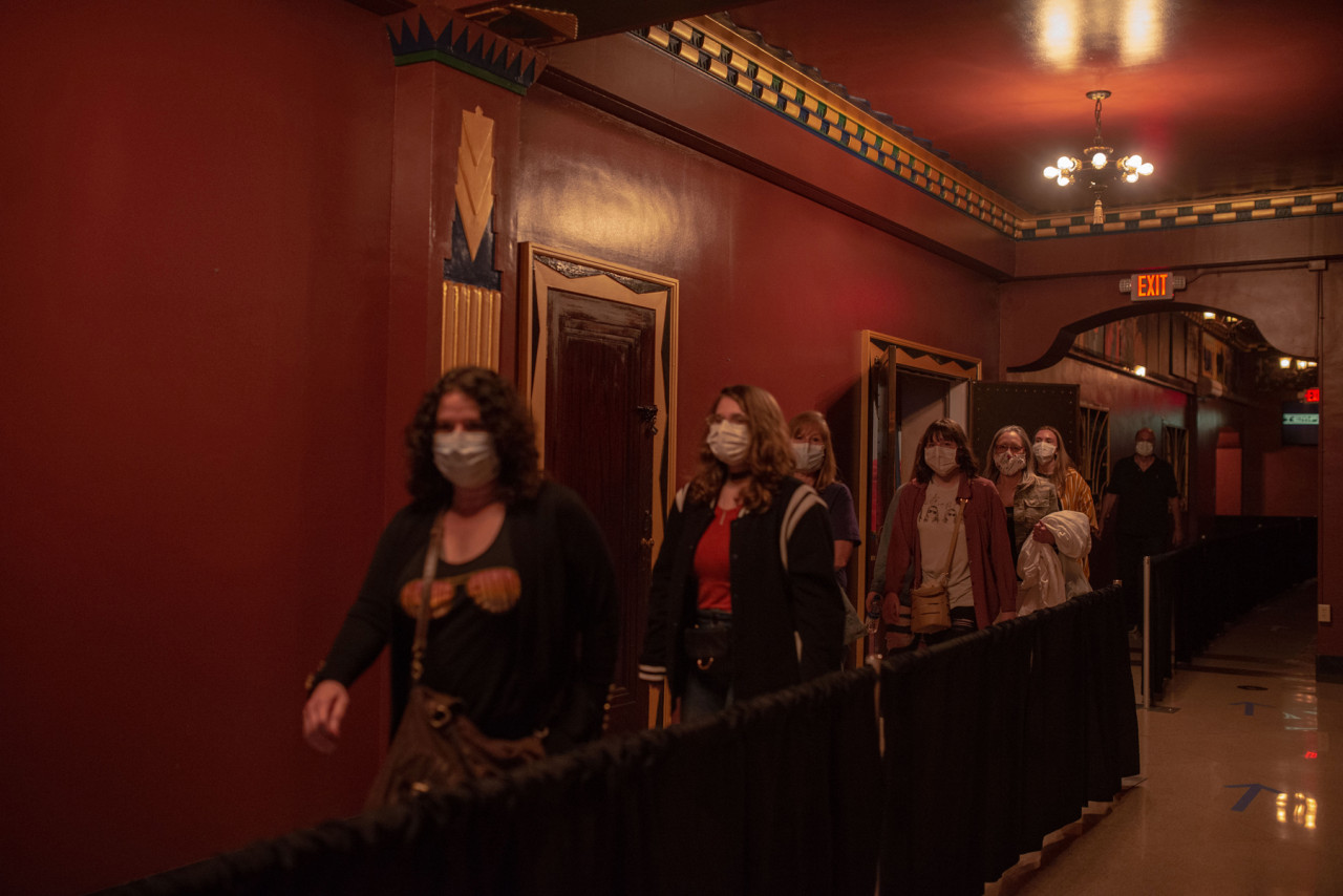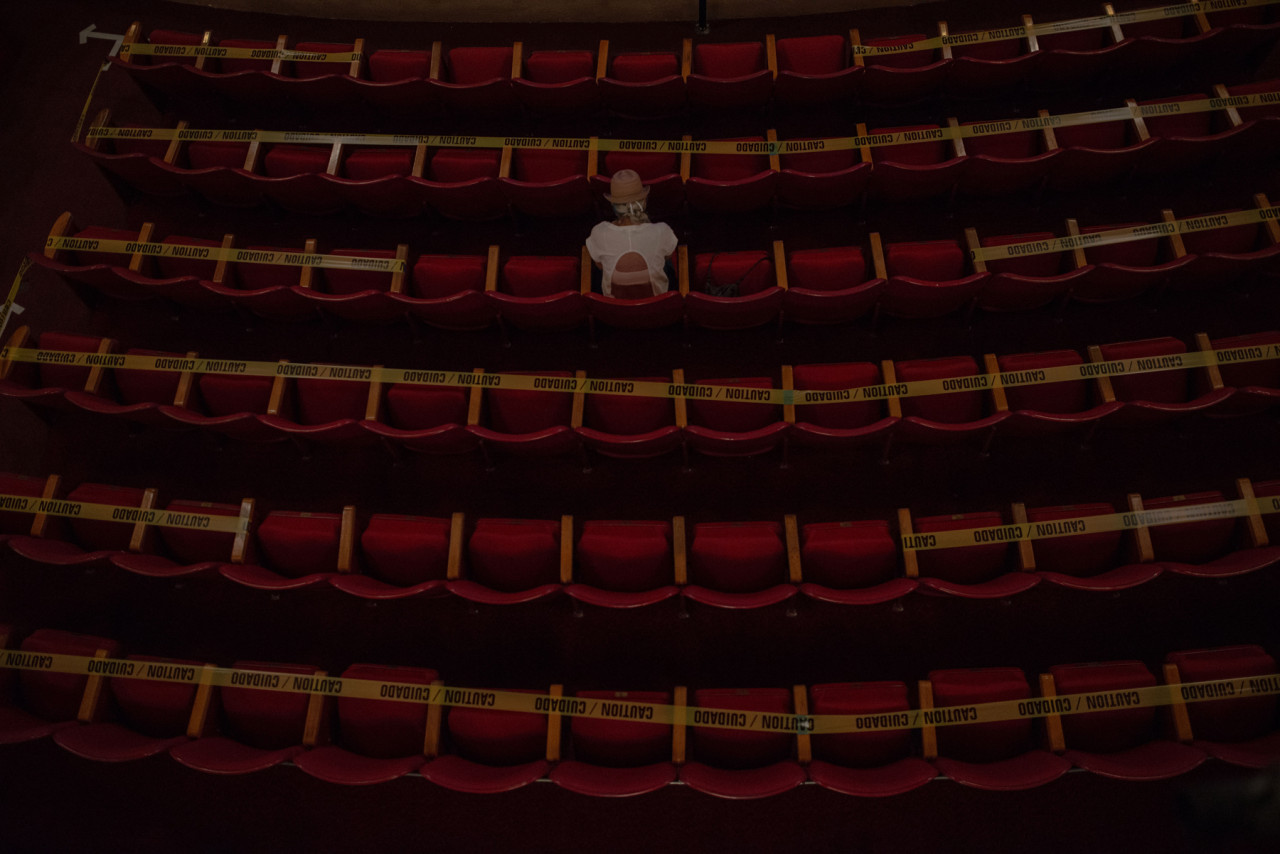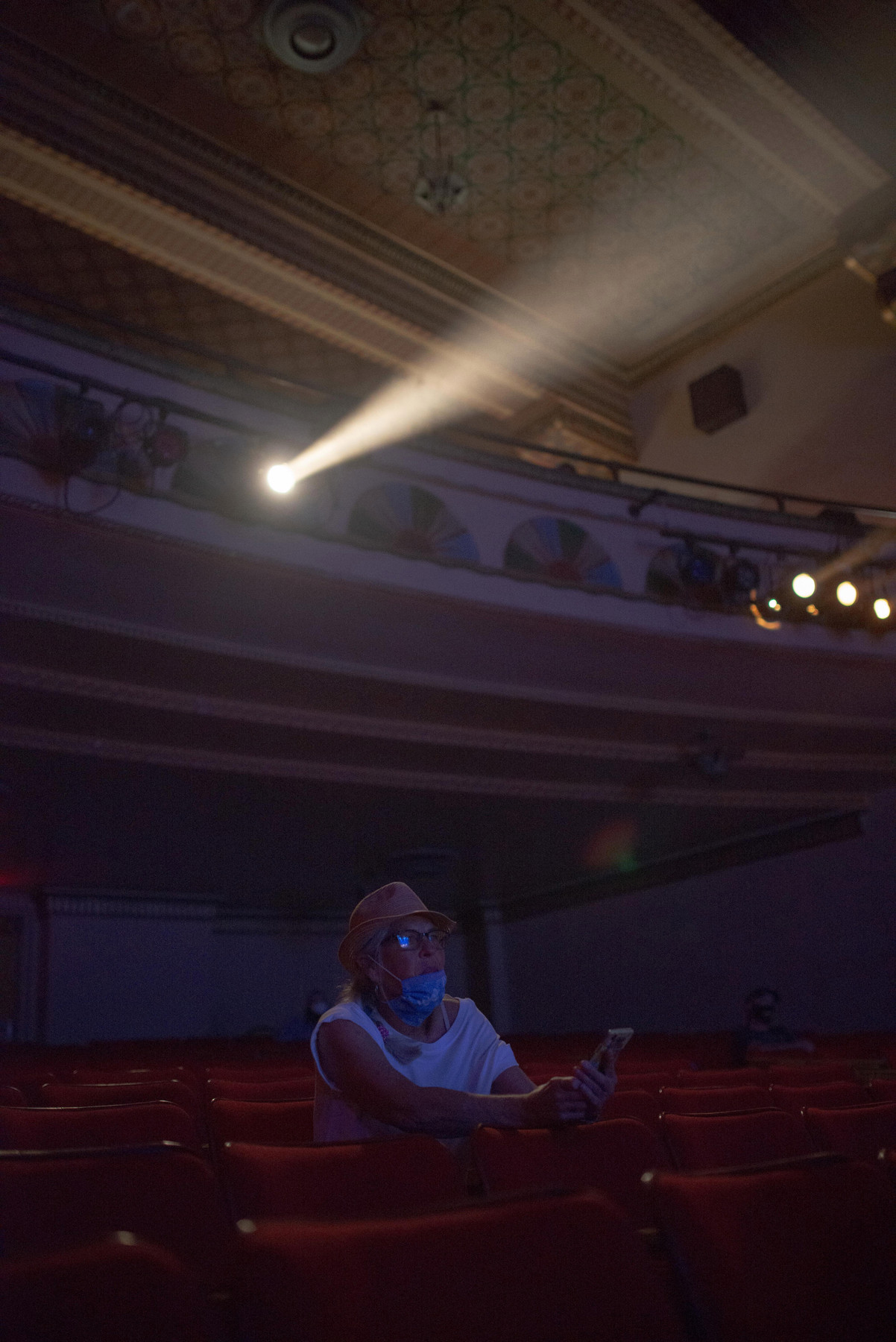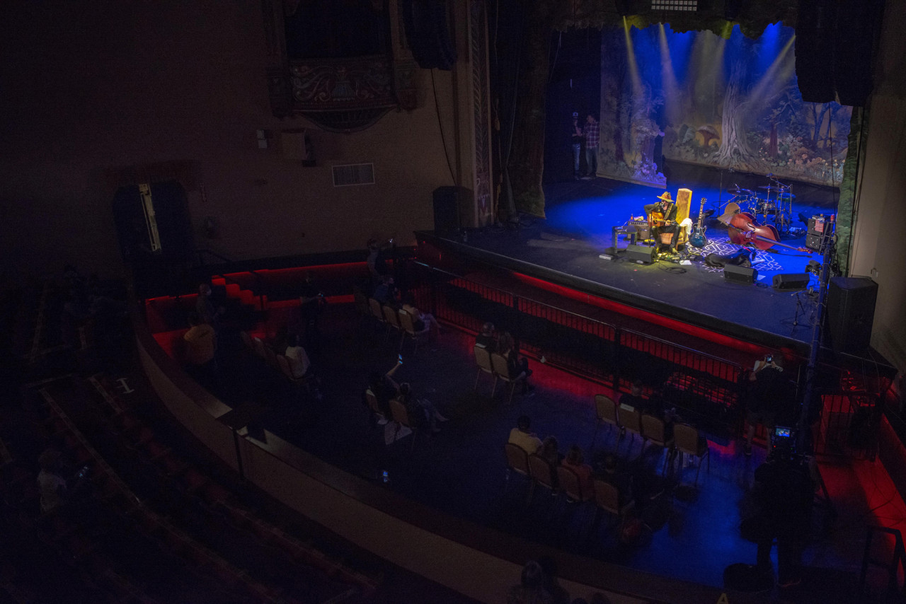Lavoratori con guanti e mascherine si assicurano che all’interno del teatro sia tutto pronto per il concerto.<br /><br />Foto di September Dawn Bottoms per Rolling Stone
