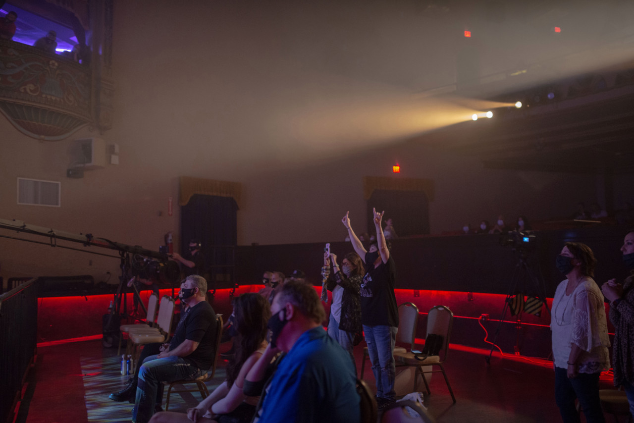 Fan con la mascherina si alzano in piedi durante il concerto.<br /><br />Foto di September Dawn Bottoms per Rolling Stone