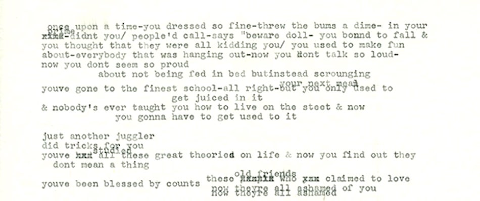 I testi scritti tra il 1960 e il 1980 sono tutti battuti a macchina, mentre i più recenti sono scritti a mano. La bozza di High Water è un delirio di correzioni, inchiostro blu e cancellature. «Dall’archivio viene fuori un Dylan incredibilmente meticoloso», dice Polito. «Un artista che ha sempre lavorato duro, che corregge il suo lavoro con grande attenzione e che non dimentica mai una buona idea».