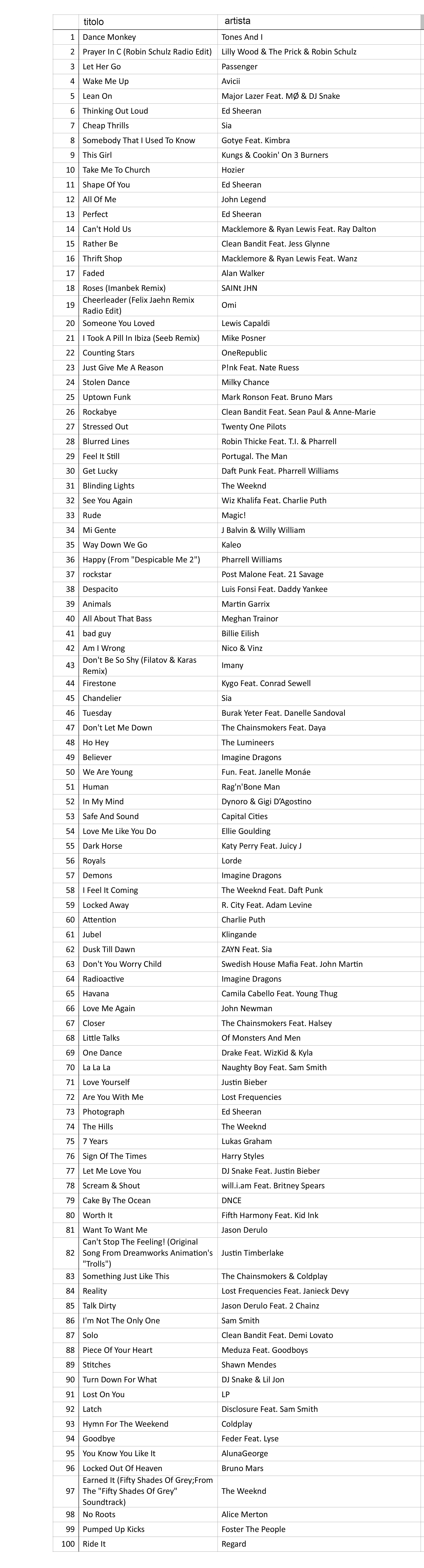 Per festeggiare il record di utenti attivi, l’app ha pubblicato la classifica dei 100 brani più cercati di sempre sulla piattaforma. Al primo posto c’è Dance Monkey di Tones and I – è un brano del 2020, cantato da una busker che si è ritrovata all’improvviso al primo posto in classifica –, seguita da Prayer in C di Lily Wood, Let Her Go di Passenger, Wake Me Up di Avicii e Somebody That I Used To Know di Gotye. In più, la piattaforma ha condiviso la Discovery Top 50, tutta dedicata agli artisti emergenti di tutto il mondo, e le classifiche di ogni città. Le trovate nell’app e sul sito ufficiale. Qui sotto, invece, la lista completa dei brani più cercati in assoluto.