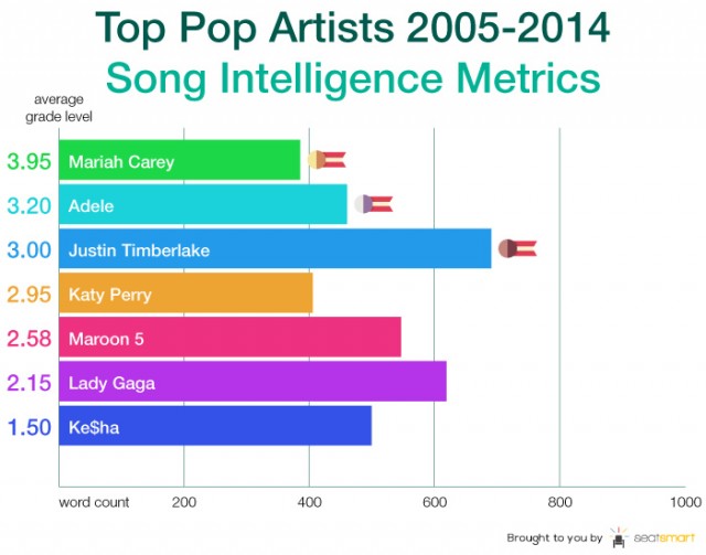 Una volta capito il meccanismo del grafico, l’analisi è immediata: il livello di lettura dei testi pop dà ragione a Mariah Carey. In più, Justin Timberlake risulta troppo prolisso e i Maroon 5 devono esplodere.*
