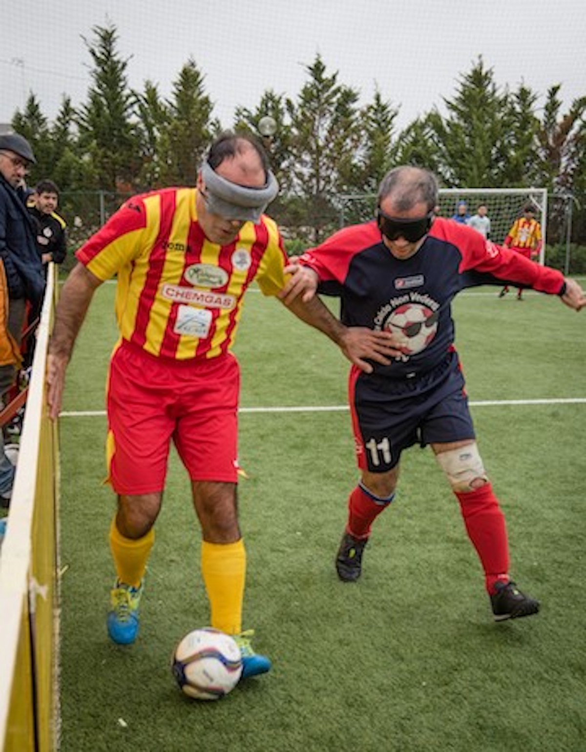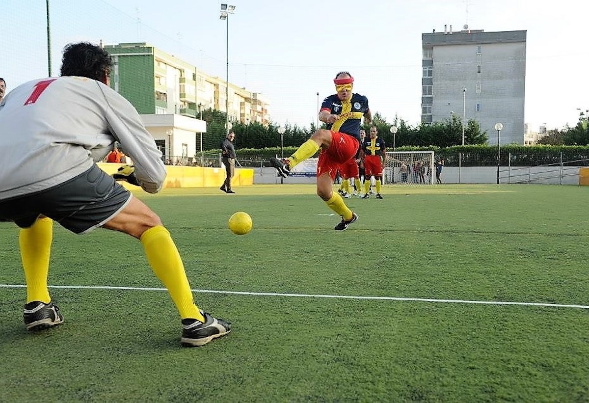 In questa disciplina le squadre sono composte da 4 giocatori non vedenti e da un portiere vedente. Un altro membro vedente della squadra, in genere il vice allenatore, viene posizionato dietro la porta avversaria e con la voce deve aiutare gli attaccanti a localizzare la porta. Si chiama, appunto, “guida retro porta”. A centrocampo, invece, i giocatori sono guidati dalla voce dell’allenatore e in difesa da quella del portiere. Per evitare il più possibile scontri pericolosi tutti i giocatori in campo devono localizzarsi, ovviamente tramite la voce, gridando “voy” quando si muovono verso un avversario, contrastano o cercano la palla. Gli spettatori devono rimanere in silenzio durante il gioco, in modo che i calciatori possano sentire la palla muoversi, le proprie voci e quelle delle guide. Tuttavia, la prima volta che si assiste a una partita del genere tutto sembra un grumo di suoni e sembra già assurdo come i giocatori possano scongiurare le craniate fra loro, figurarsi trovare la porta e pure segnare. Per Dongiovanni, il regista, più voci non rappresentano un problema. «L’udito è il senso che ho sviluppato di più. Riesco a captare e ascoltare contemporaneamente più conversazioni. Una cosa che mi aiuta molto nel mio ruolo a centrocampo».