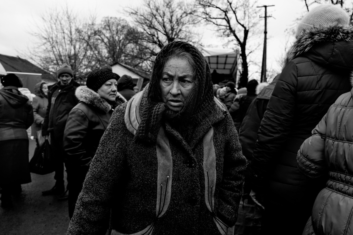 Una signora in coda di fronte a un furgone russo che distribuisce cibo e beni di prima necessità nel villaggio di Granitne. Il villaggio è stato appena conquistato dalle truppe russe che cercano ora conquistare anche i cuori dei cittadini che inglobano nei propri territori, fornendo loro aiuti, assistenza ma anche propaganda. <br /><br />Foto: Gabriele Micalizzi<br /><br />Testo: Luca Steinmann