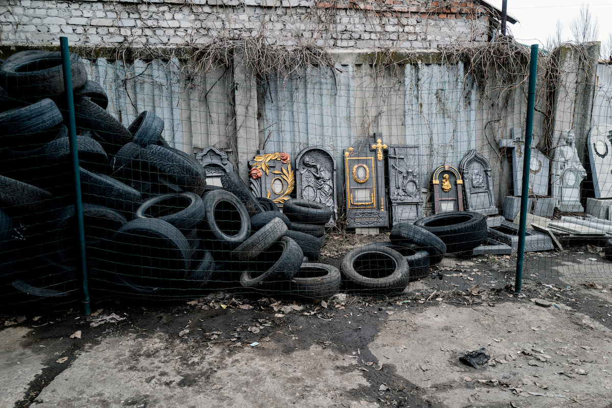 Ruote e lapidi a Gorlowka. Dopo otto anni di guerra non si distingue più tra economia normale e economia bellica. Ormai anche dal benzinaio si possono comprare le lapidi. <br /><br />Foto: Gabriele Micalizzi<br /><br />Testo: Luca Steinmann
