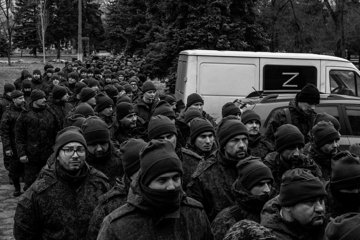 Soldati russi in fila per il rancio prima di partire per il fronte. Siamo a Granitne, il paese è appena stato conquistato e reca ancora i simboli ucraini. Migliaia di soldati russi nella piazza centrale attendono al freddo di andare al fronte per continuare l'avanzata. Volti scavati dalle fatiche, divise militar versi senza mostrine, capelli di lana, kalashnikov in spalla, baionetta legata alla cintura, pantaloni alla zuava, stivali. Le immagini ricordano incredibilmente le foto della campagna di Russia nella Seconda Guerra Mondiale. È come se il tempo si sia ibernato. <br /><br />Foto: Gabriele Micalizzi<br /><br />Testo: Luca Steinmann