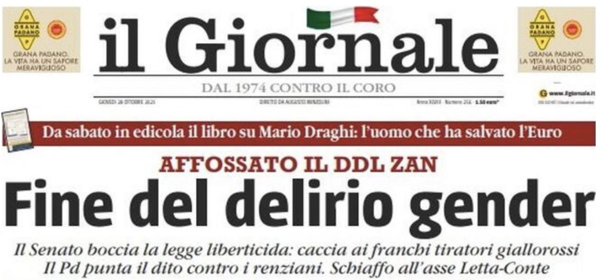 “Piange il Pd. Che bello”, titola il primo, che esalta il centrodestra e parla di vittoria del libero pensiero – in riferimento alla bufala diffusa da destra secondo cui il ddl Zan avrebbe introdotto la censura rispetto a determinate opinioni. Il Giornale è ancora più esplicito: “Fine del delirio gender” è il titolo a tutta pagina.