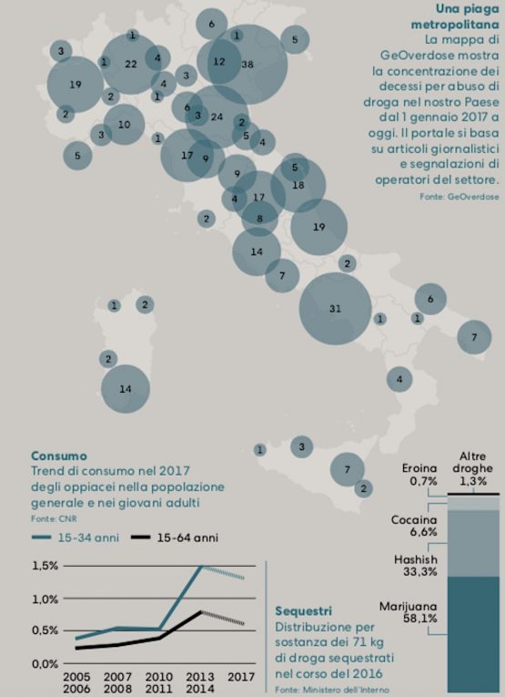 Nelle ultime settimane se ne sta parlando e scrivendo molto, principale teatro della discussione è il Corriere della Sera, che, visto il numero di overdose in aumento negli ultimi mesi (qui i dati aggiornati), sta riservando grande spazio alla questione sulle proprie pagine e online. A contribuire a concentrare l’attenzione mediatica sulla materia anche lagiovanissima età di alcune delle vittime – da Alice Bros, morta nel bagno della stazione di Udine, a Desirée Mariottini – e la drammaticità di alcune storie divenute di dominio pubblico, come quella del padre in cerca del proprio figlio nel famigerato Bosco di Rogoredo di Milano, raccontata proprio dal quotidiano di via Solferino.