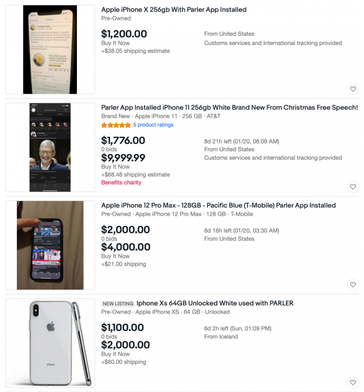 In questo momento, eBay è pieno di annunci che mettono in vendita iPhone con Parler installato, a prezzi che vanno dai 1000 agli 8500 dollari. Se per caso avete un iPhone e per curiosità avevate scaricato Parler, insomma, è il vostro momento. Da qualche parte negli Stati Uniti c’è un sostenitore di Trump disperato e disposto a investire un quantità spropositata di soldi per accedere al social network – che tra l’altro, al momento, è offline. Ma questo magari non diteglielo.