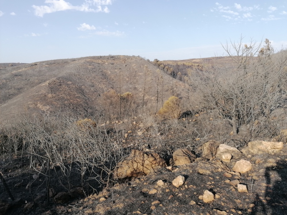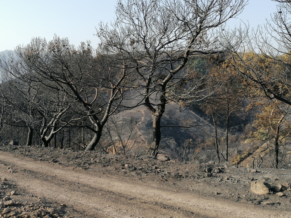 Sulla strada provinciale che collega Tresnuraghes alla marina di Porto Alabe, si può ristabilire il percorso delle fiamme seguendo la linea d’ombra sui monti segnata dal fuoco, dai monti di Santu Lussurgiu e Cuglieri fino al piccolo canale che porta al mare. La guida è Giovanni Piras, ex poliziotto in pensione che ha perso il suo uliveto: “A me è andata bene, il mio uliveto è perso, e il vigneto solo bruciacchiato”. In tanti hanno tirato un sospiro di sollievo quando hanno saputo che una parte del cantiere di rimboschimento della guardia forestale – un progetto iniziato mezzo secolo fa – è stato salvato dalle fiamme. Solo attraversando entrambe le fasce del bosco, passando dal grigio, aspro e incolore della terra bruciata fino alla parte salva, ancora popolata da ettari di pini marittimi, eucalipti e sottobosco di macchia mediterranea si prende coscienza del danno evitato dal dispiegamento dei mezzi di soccorso. “Sono felice”, afferma Piras, “pensavo che non avremmo più potuto fare le nostre passeggiate domenicale nei boschi”.