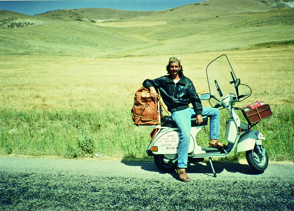 Giorgio Bettinelli protagonista di diversi viaggi a cavallo di una Vespa. Uno tra i tanti, Roma - Saigon