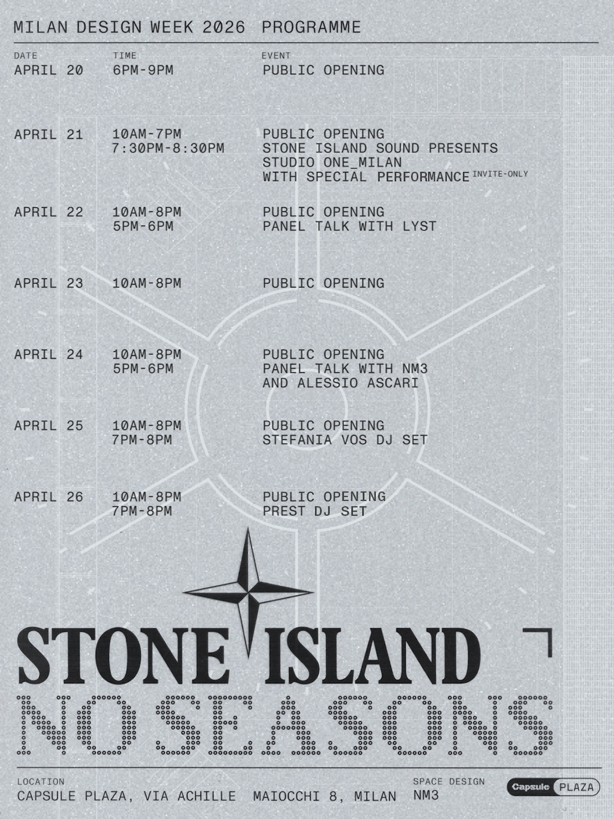 Ad accompagnare l’installazione, aperta al pubblico per tutta la settimana, c’è un programma di eventi pensato per estendere il progetto oltre i capi esposti. Si parte il 20 aprile con il public opening, mentre il 21 aprile sarà la volta di Stone Island Sound, che presenta Studio One_Milan con una performance speciale a inviti. Il 22 aprile è in programma un panel talk con Lyst, mentre il 24 aprile il dialogo si sposta su NM3 e Alessio Ascari, direttore di Kaleidoscope, per parlare di design, spazio e linguaggi visivi.