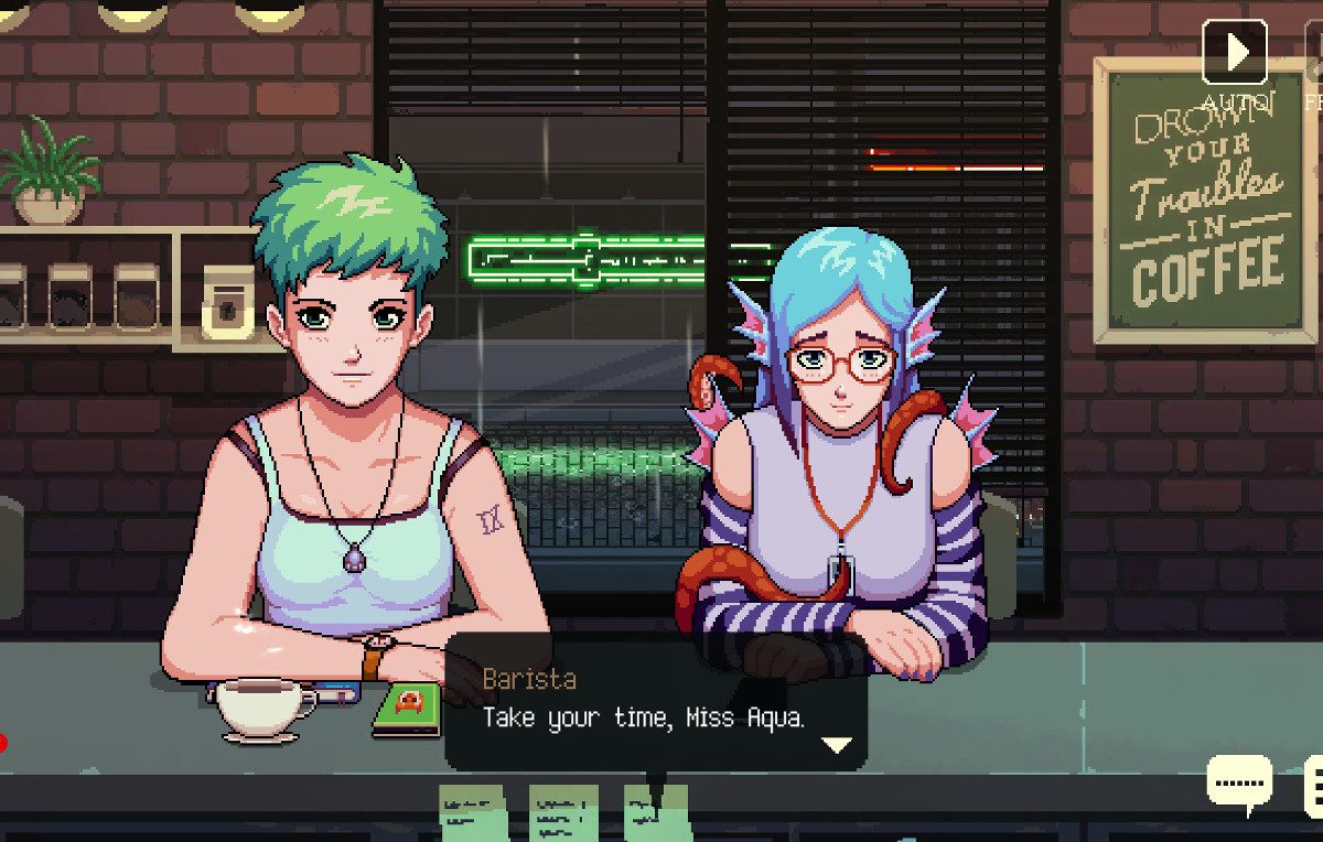Coffee Talk è ambientato nella Seattle del 2020, ma in un mondo alternativo pieno di creature fantastiche, alieni ed esseri di ogni tipo. Questa scelta particolare ha permesso agli sviluppatori di creare un’atmosfera di massima accettazione, come se il bar si trovasse nella stazione stellare più affollata dell’universo di Star Trek (in quello di Star Wars le sparatorie sarebbero state all’ordine del giorno). Se per qualche strano motivo un ambiente promiscuo con persone di ogni sesso e razza vi infastidisce, forse fareste meglio a smettere di giocare e a recuperare un bel po’ di libri. La cultura vi aiuterà a migliorare.