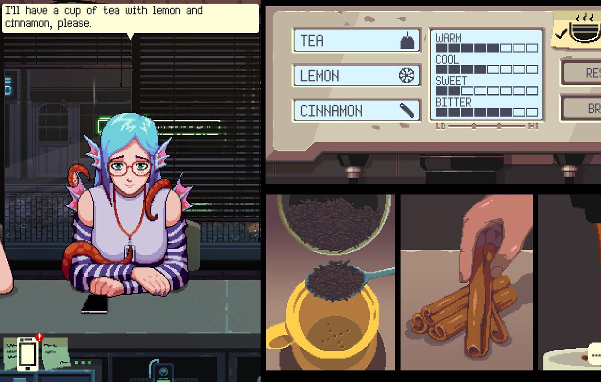 A differenza di molte altre visual novel disponibili sul mercato, Coffee Talk offre al giocatore un ruolo fin troppo passivo nello sviluppo della storia. Non è infatti possibile indirizzare i dialoghi con i clienti e non si può fare altro che seguire la narrazione senza intervenire. “Guardare, ma non toccare”, come direbbe Al Pacino ne L’avvocato del Diavolo. L’unica possibilità di interazione disponibile è quella legata alla preparazione delle bevande.